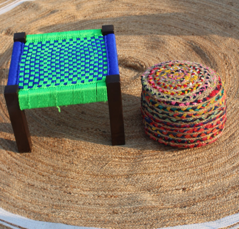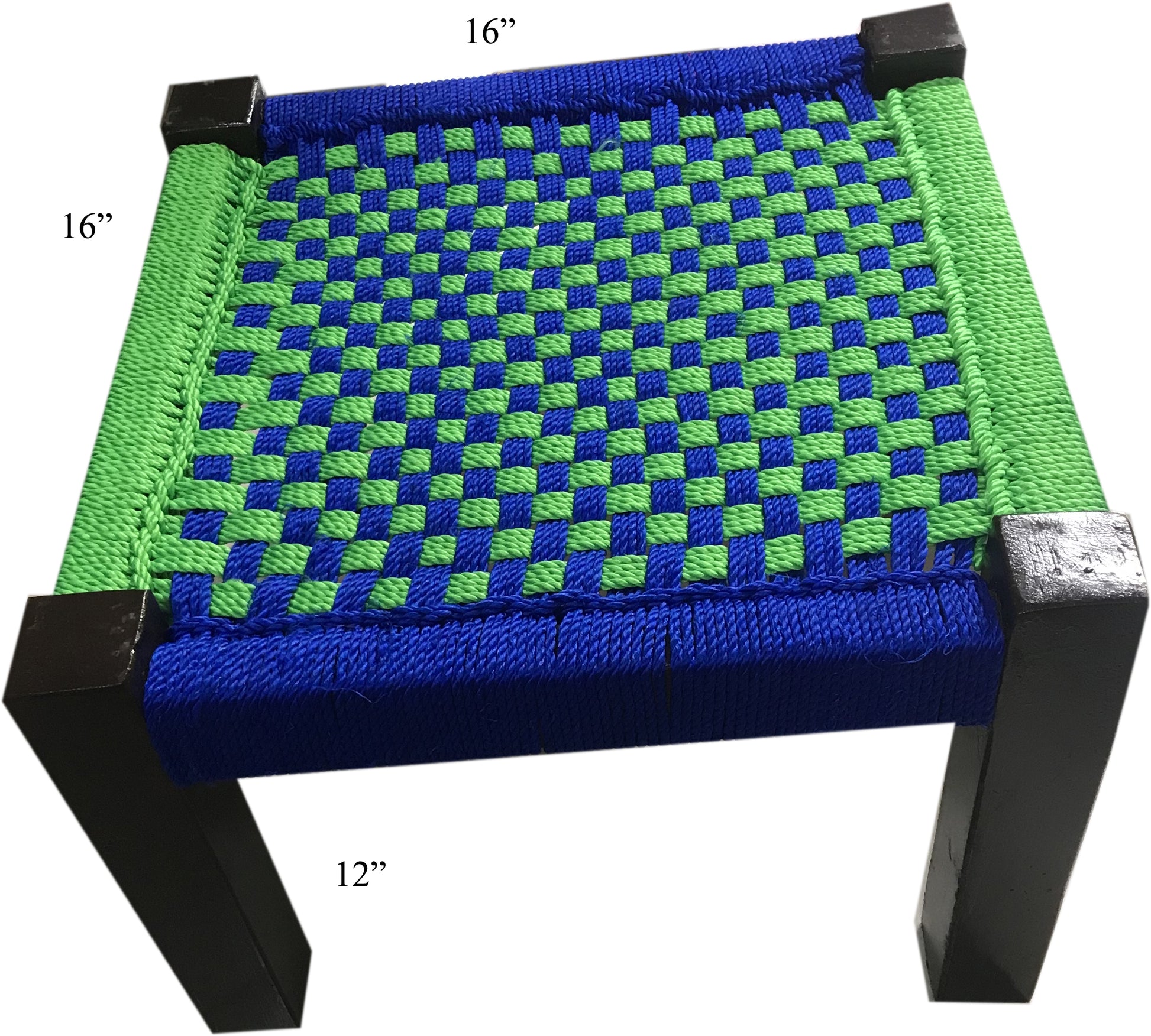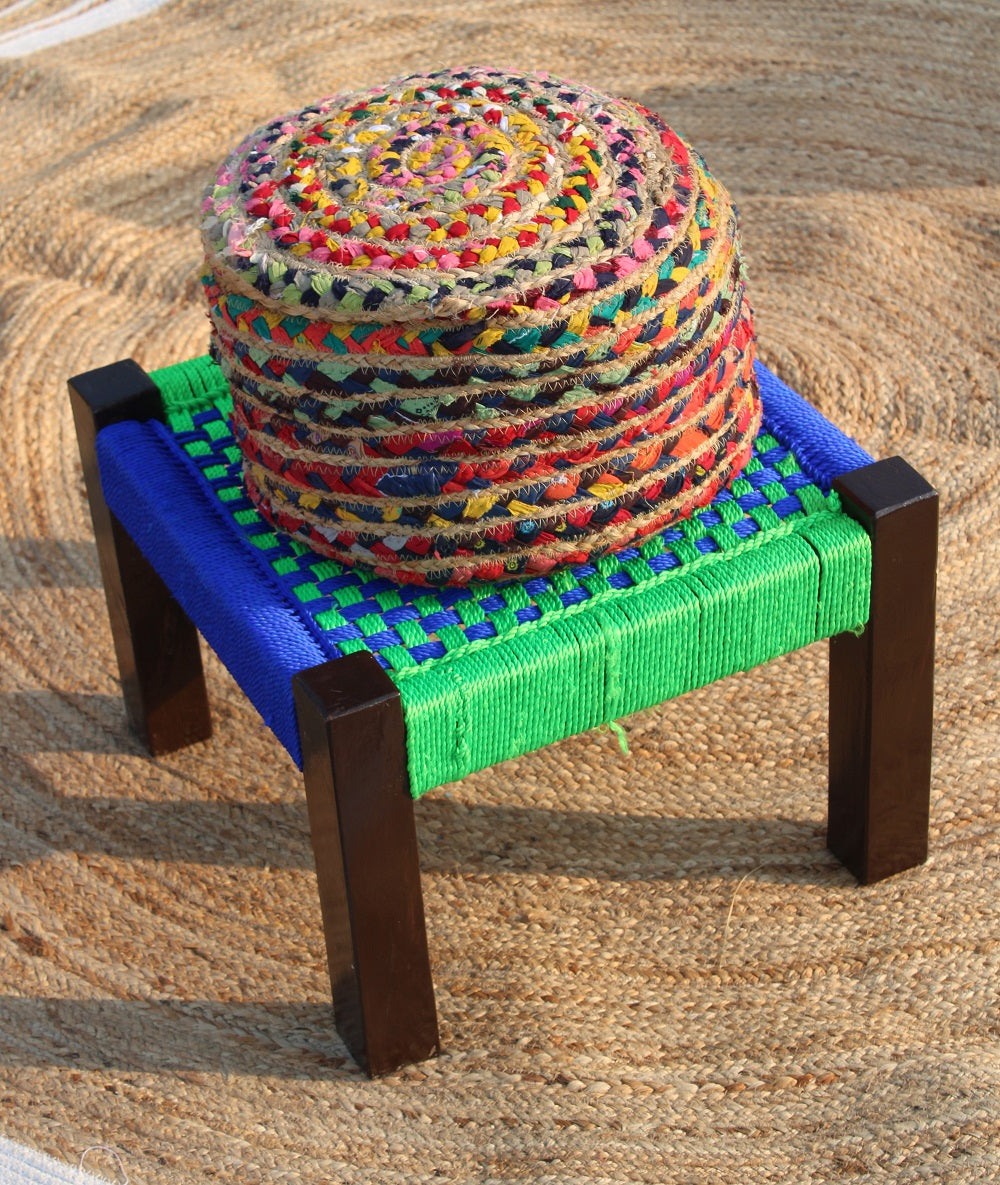 Wooden Weaving Chowki With Green & Blue Chess Board Pattern for balcony furniture