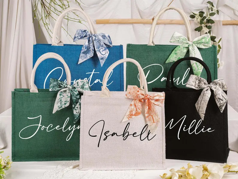 Personalized Bridesmaid Jute Tote with Name Scarf – Custom Beach Bag for Wedding & Bachelorette Gifts Pack of 50